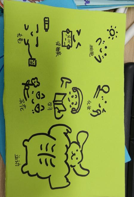 派对尾声,老师准备了OH卡片让同学们自行抽取,随后让同学们根据随机抽取的主题画出一幅画,画的内容与摆脱无聊情绪有关,同学们坐成一个圈自由涂鸦,有的写心情文字,也有人相互鼓励调侃作品,气氛轻松愉悦。